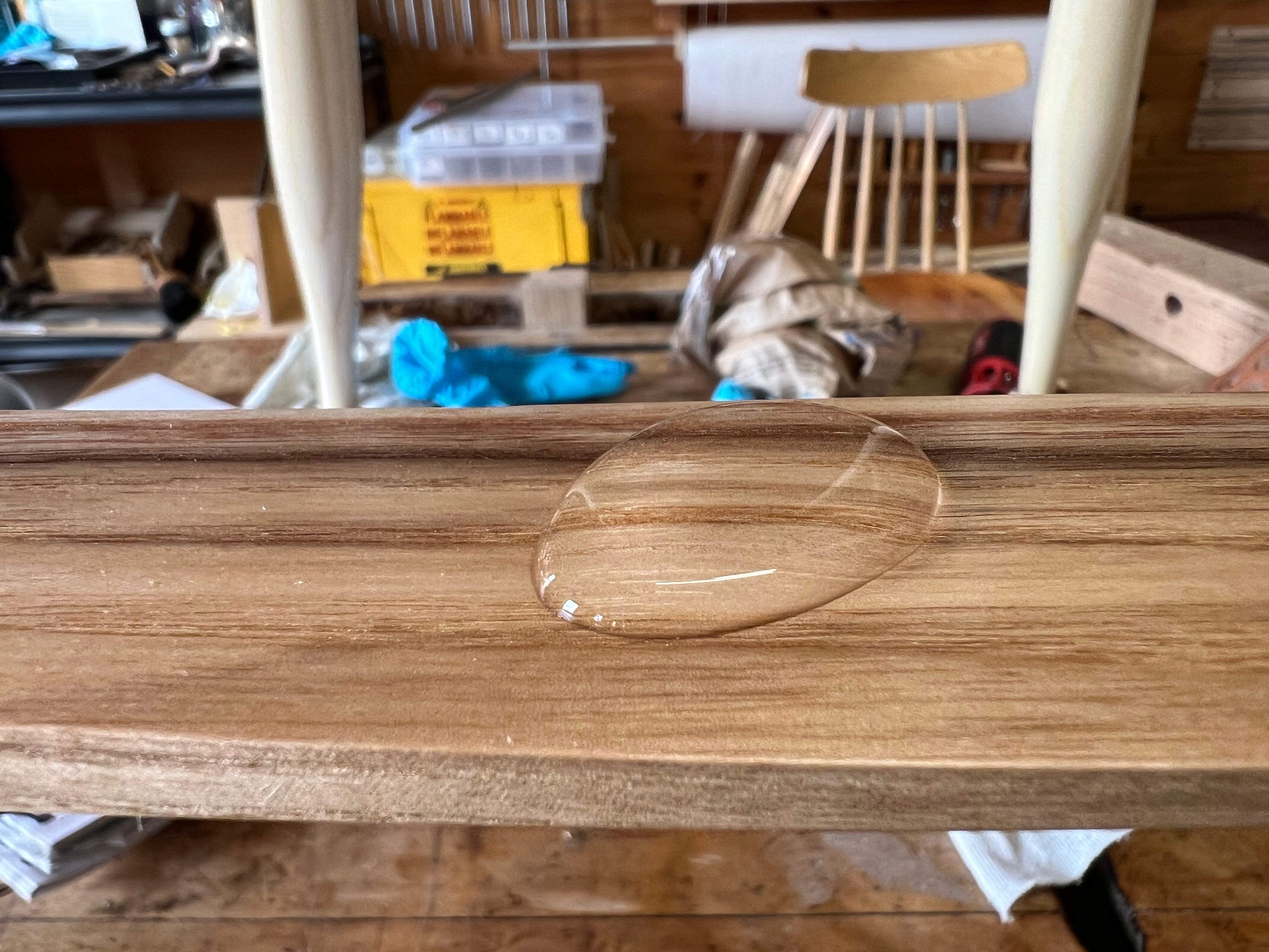 Here is what I want from a clear finish. It has great water resistance but doesn’t look like a thick coating. It’s durable over time, easily renewable and doesn’t turn sickly yellow. I also want the surface to have a good feel, not too much friction, but not be slide out of the seat waxy. Most importantly, it has to be fast and easy to apply in a shop that isn’t pristine and dust free.