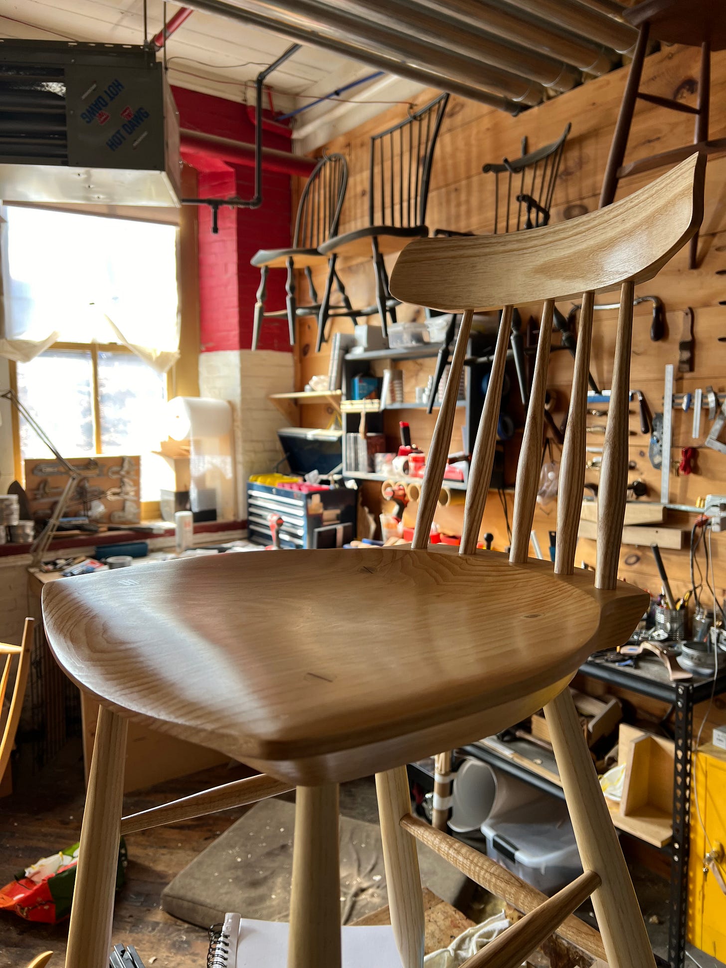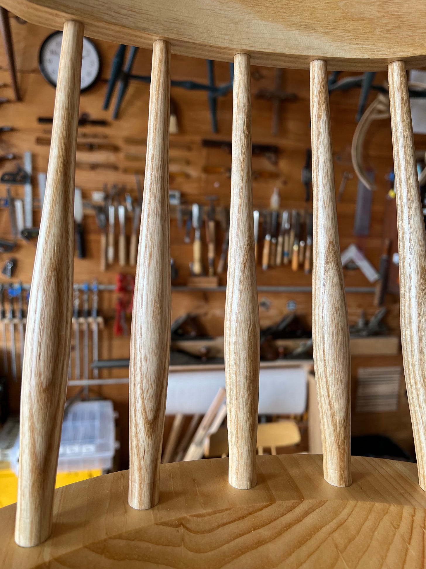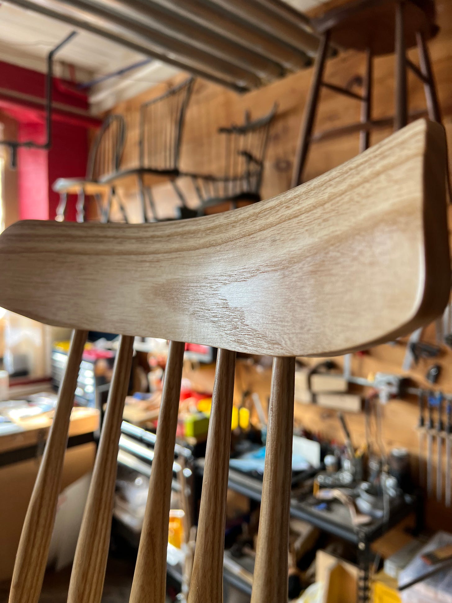 But in true contrarian fashion, I soon wanted to push against my acceptance of paint and try my hand at a clear finish. This shift was more challenging than I expected. I had to contend with the color and visual competition of the wood when designing. I don’t make “traditional” chairs unpainted, I find the grain pattern on the shapely parts too active and distracting from the overall form, plus, the variety of woods can be an unwelcome contrast. So I had to learn to make forms that were simpler to lower the volume on the grain pattern and still be harmonious. It still surprises me how far just a little shaping will go when leaving the wood grain showing.