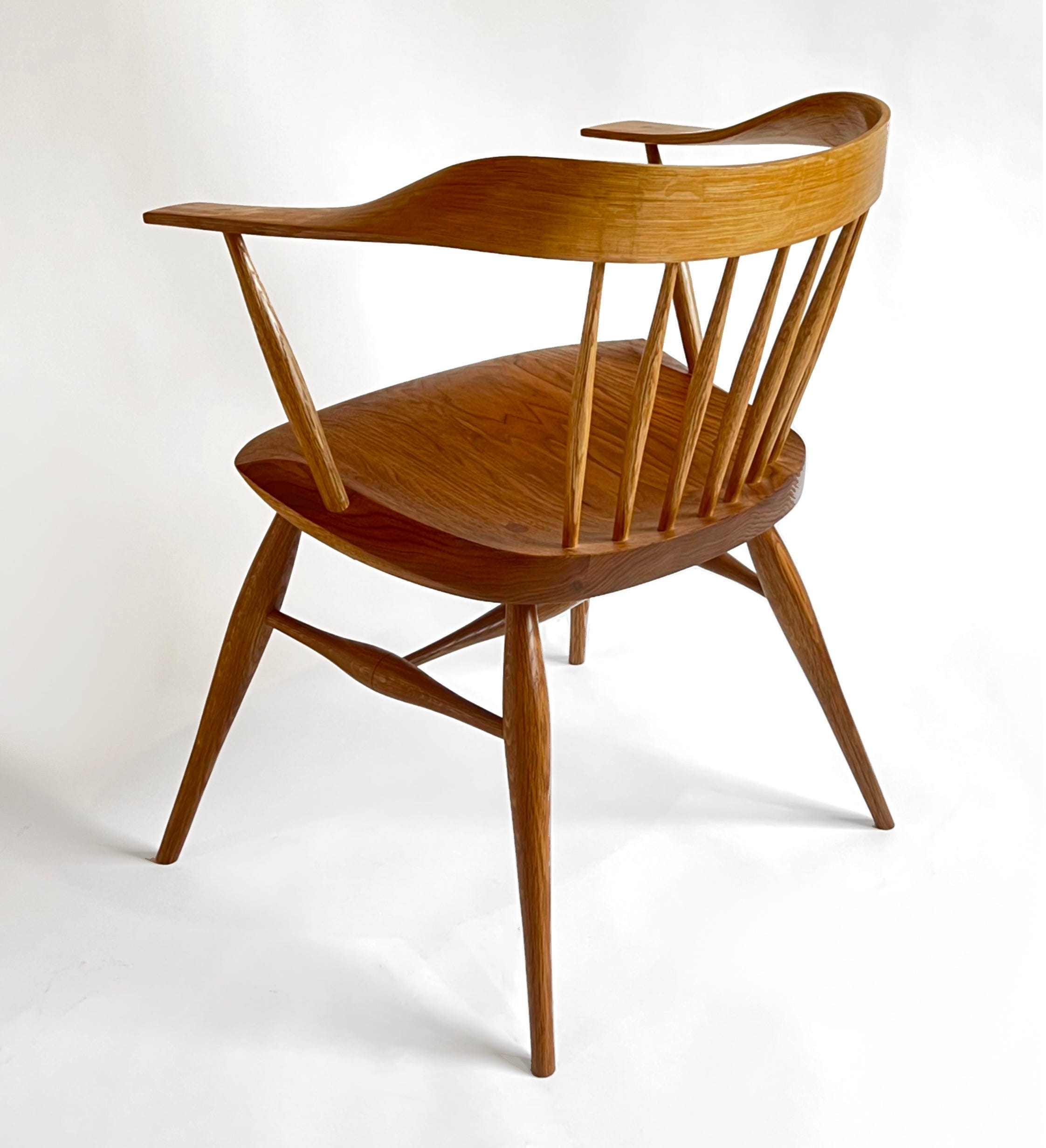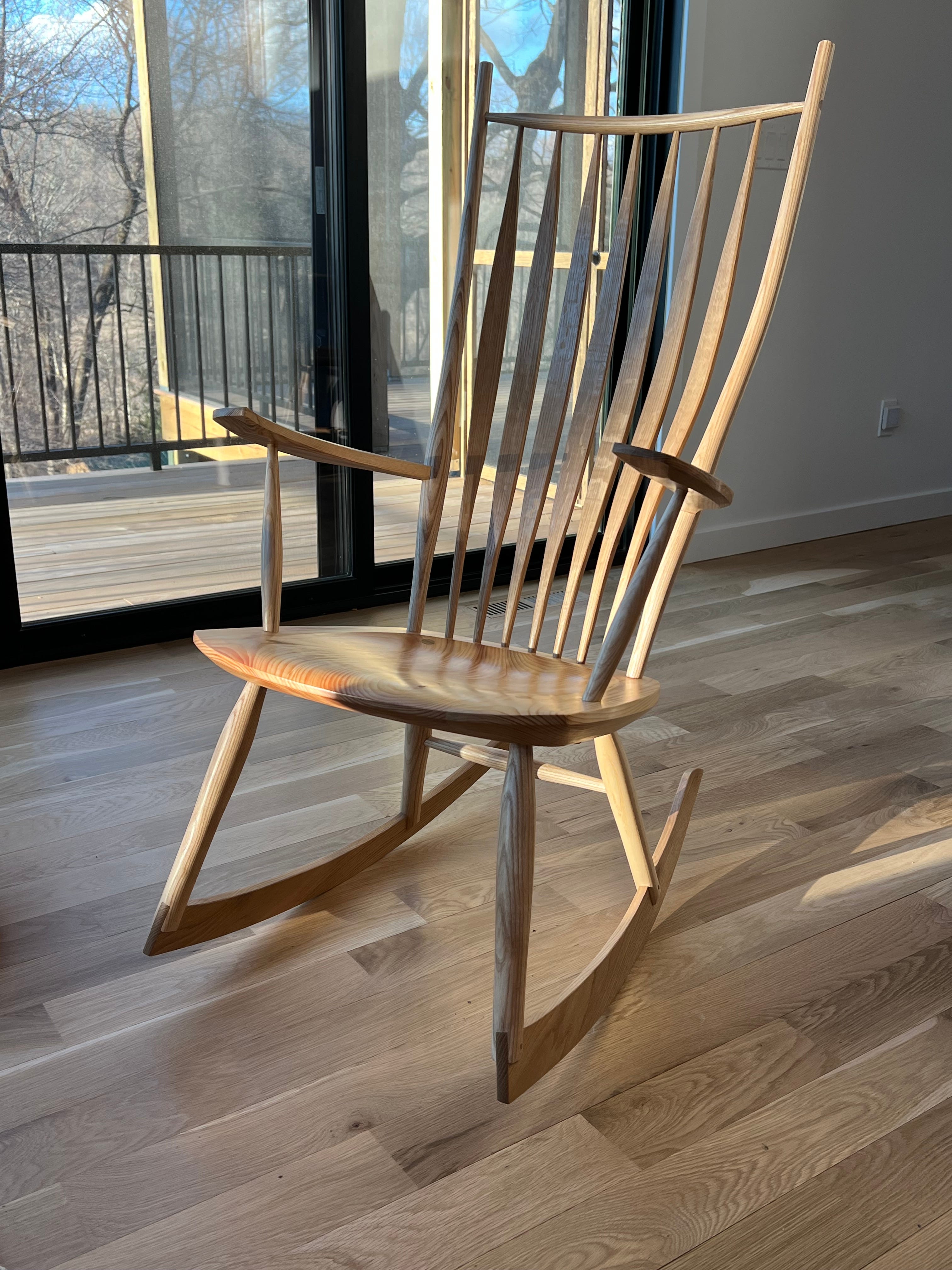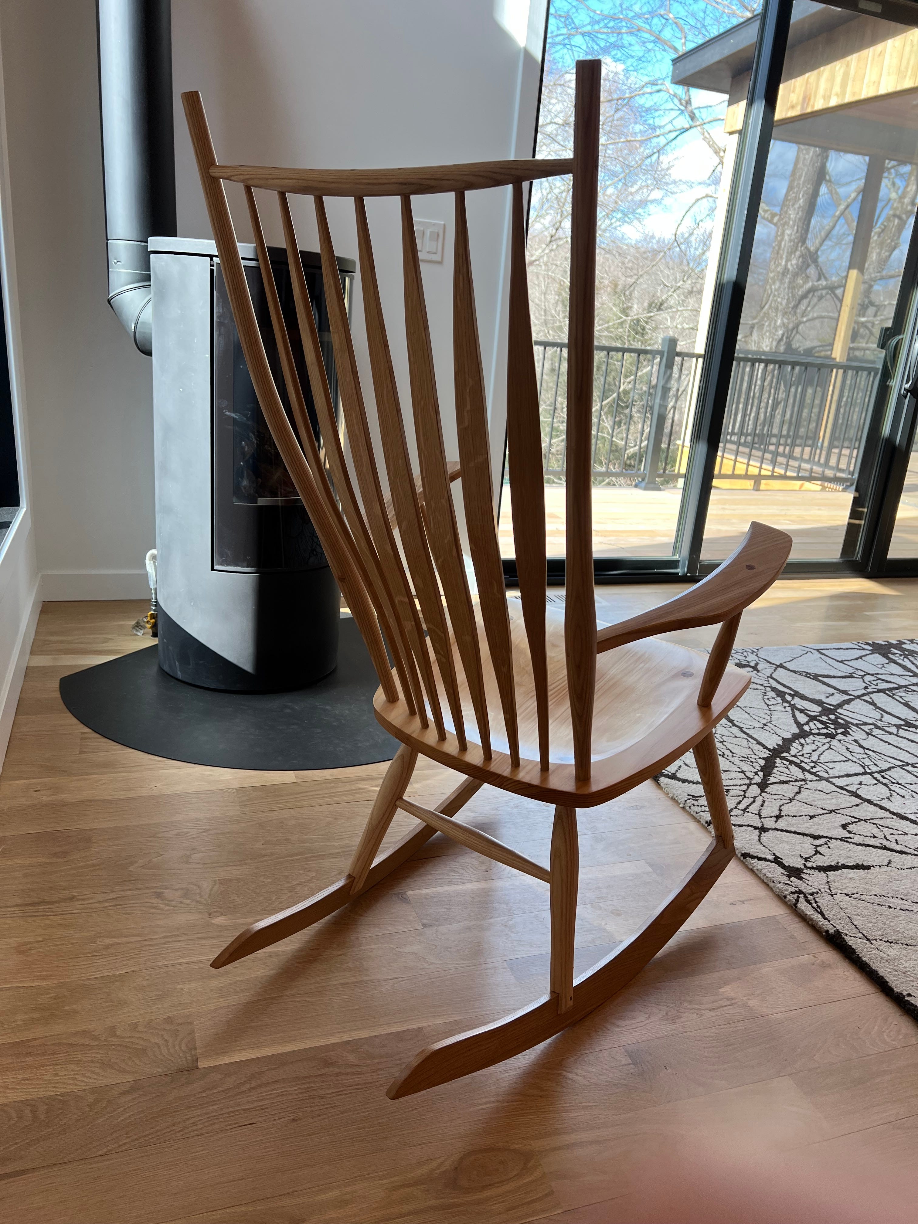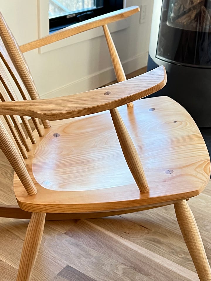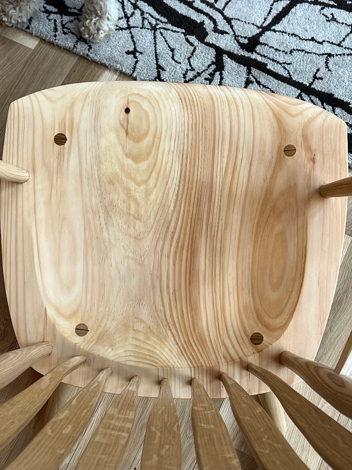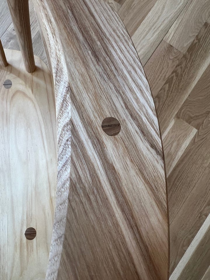 For the finish on this, I did some new things. I wanted to keep the ash clean and blonde in tone. So I sealed it with shellac. Then I finished it with multiple coats of hard wax oil (Saicos brand high gloss, then satin). For the seat, I wanted more of the pines rich tones, so I finished it with two coats of Tru oil and then two coats of the hard wax oil. I really like the interplay of a hard seal coat (shellac or Varnish) with the hard wax oil. Often, I find the hard coats can look a bit too shiny and uneven, especially on woods that have variable absorption. But a couple of coats of the hard wax oil evens out the sheen, gives a nice feel and leaves the wood protected, but seeming sort of naked feeling.