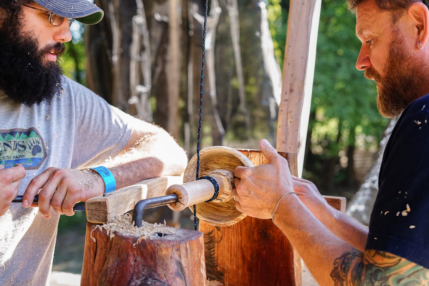Eric Goodson (right) is an expert pole lathe turner and I’m thrilled to add this skill the roster.